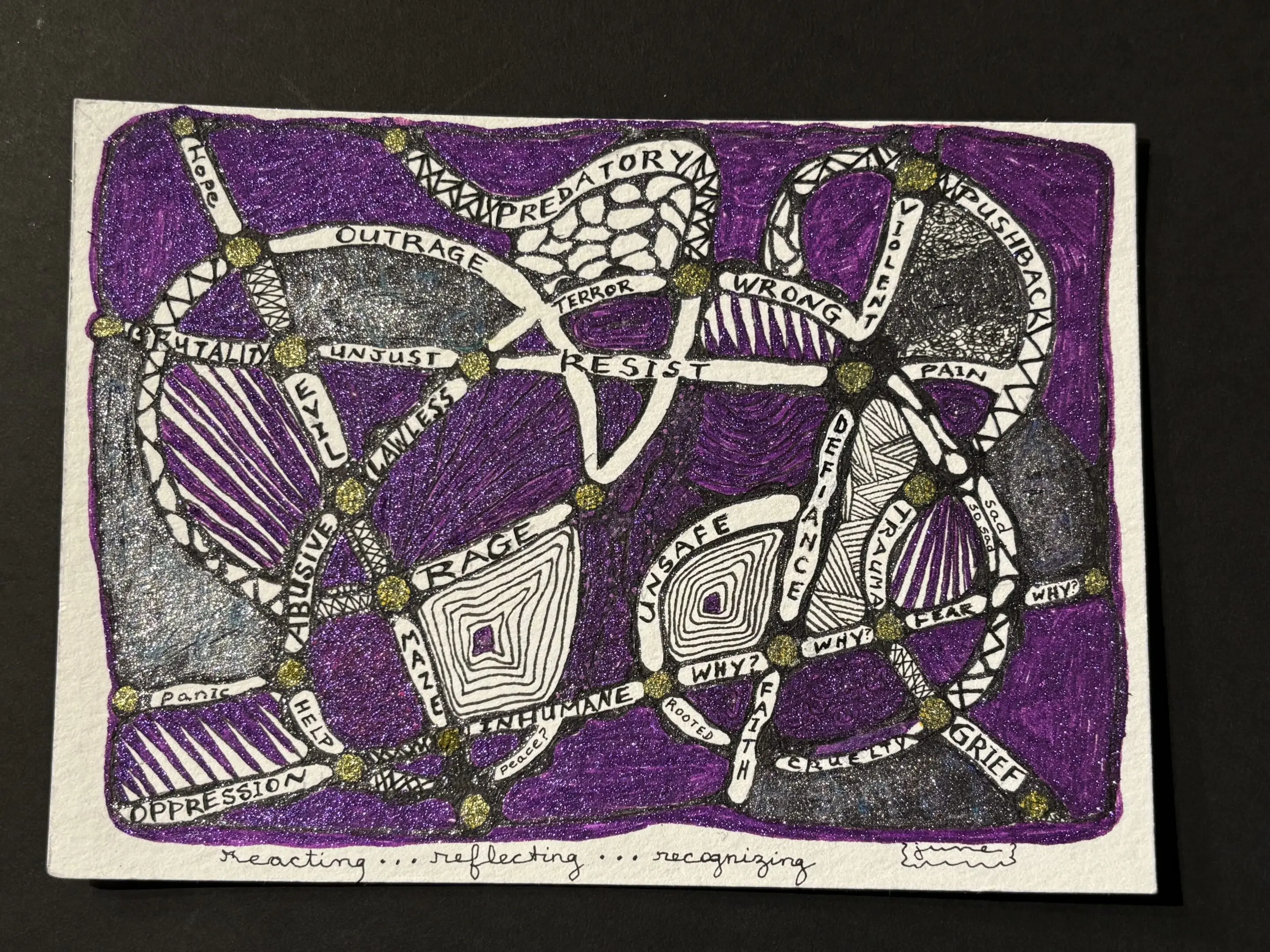 A black pen found its way into my hand and squiggles and waves and patterns and words began to surface tonight. Living alone, there is no one here with whom I can process it all because I live alone. I found that it felt good to say the words out loud, write the words, spit the words – and realize that tiny fragments of hope and rootedness and faith are there too. They’re few, but they’re there. And I am grateful to see that they are – they exist – they’re there.