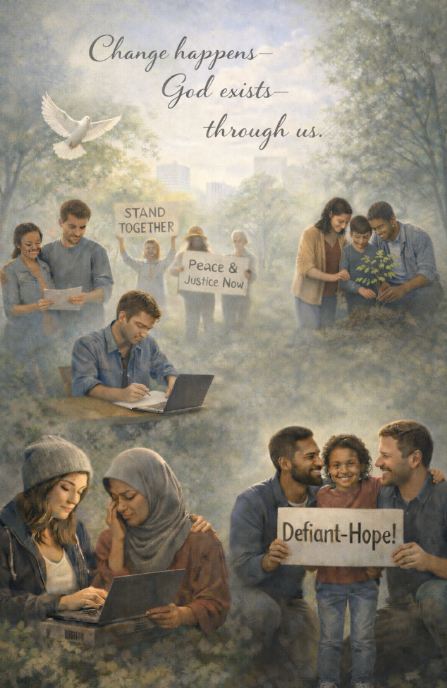 I believe In God – a God that works through people … like those who are blogging, protesting, speaking up and out; those who are peacefully resisting, calling their political leaders, helping others get to polling stations; those in positions of leadership (political, economic, media, education, business, etc.) who exercise that leadership from positions of integrity; those helping strangers or neighbours or friends in simple ways, in quiet ways, in gentle ways; those deployed in fragile countries and situations and are doing their jobs in accordance with the vows they took.